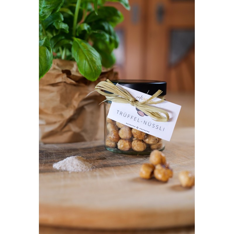 Haselnüsse, Zucker, Eiweiss, Salz, Kartoffelstärke, Reismehl, Trüffel, Champignon