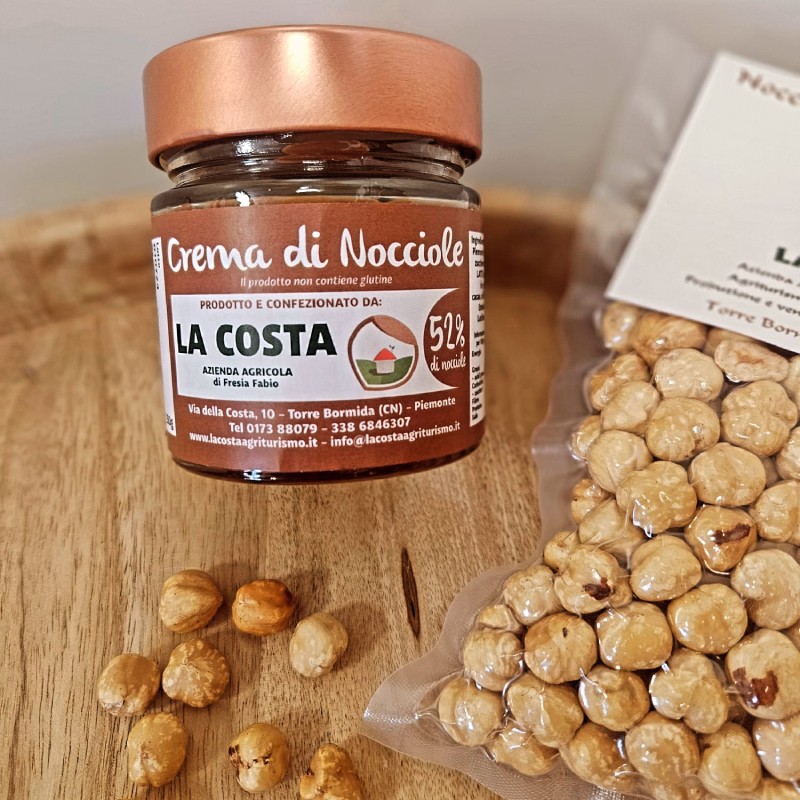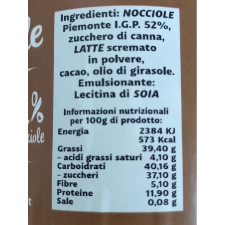 Zutaten: Haselnüsse IGP Piemont 52%, Rohrzucker, Magermilchpulver, Kakao, Sonnenblumenöl. Emulgiert: Sojalecithin