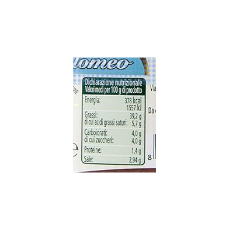Inhalt: Olive die qualità Taggiasche in salamoia (80%), olio extra vergine di oliva (18%), sale, erbe aromatiche (timo, alloro, rosmarino), correttore di acidità, acido citrico.