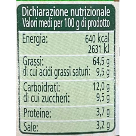 Pereponi 40%, Sonnenblumenöl, Cashewkerne, Parmigiano Reggiano, Käse, Molke, Salz, Lysozym aus Ei, Schmelzsalz, Tomaten, Salz, Balilikum, 2%, Olivenöl, Pecorino Romano 2%, Pfefferpulve,