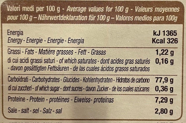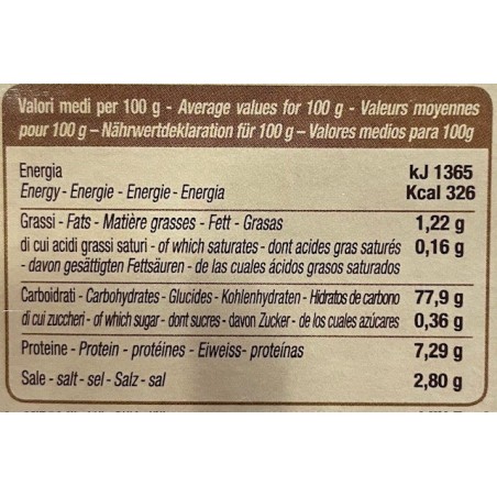 Carnaroli-Reis (93,28%), Gemüsebrühe (Kochsalz, Maisstärke, Hefeextrakt, Pflanzenextrakt (aus Sojabohnen), Gemüse in unterschiedlichen Proportionen (Zwiebel, Sellerie, Karotte, Petersilie), natives Olivenöl Extra 3%, Gewürze), Käse, Käsepulver, halbfertig Emmenthal-typ, Zwiebel, Trüffelaroma, Trüffelpulver, schwarzeer Sommertrüffel (tuber aestivum 0,2%). Kann glutenhaltiges Getreide enthalten.